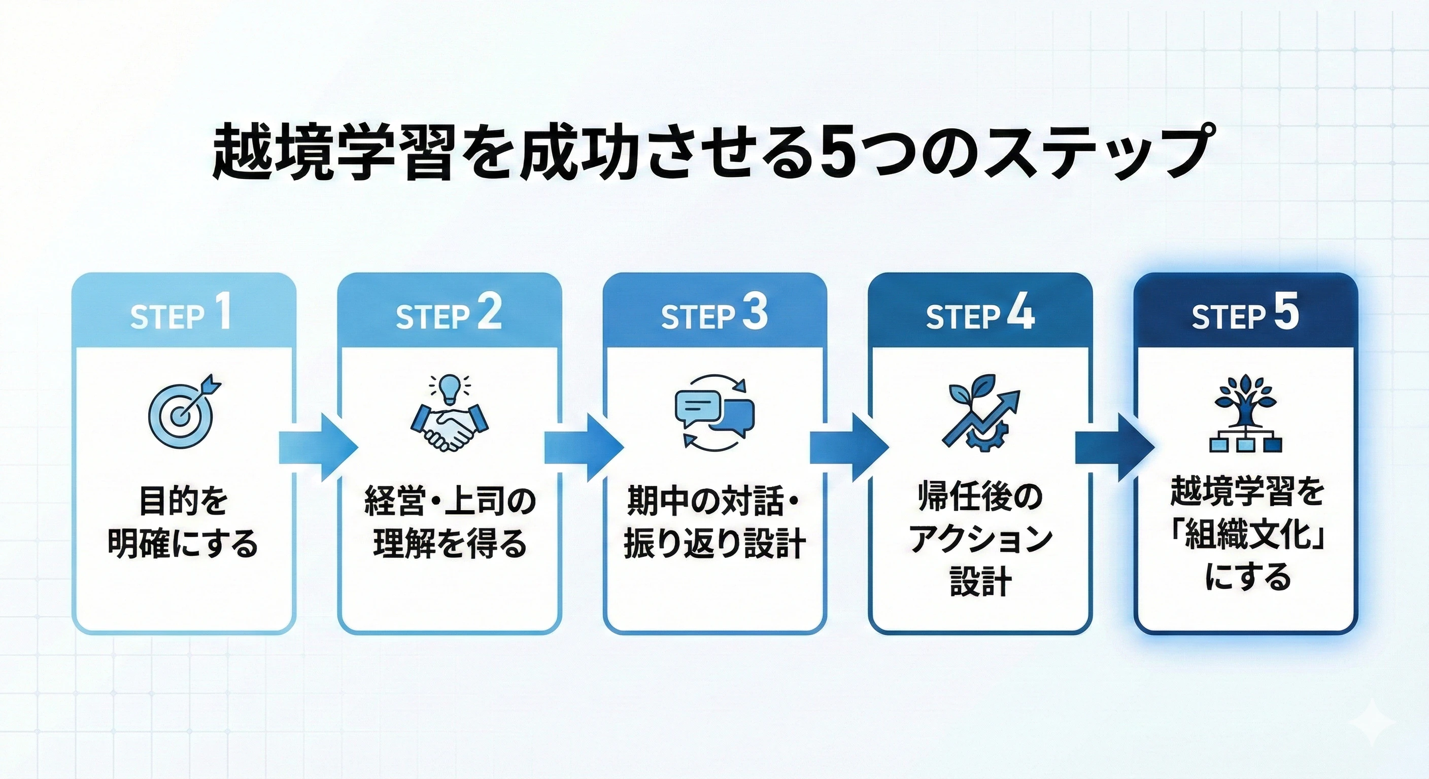 越境学習は「参加させれば終わり」ではありません。成果を最大化するためには、以下の5つのポイントを押さえることが重要です。