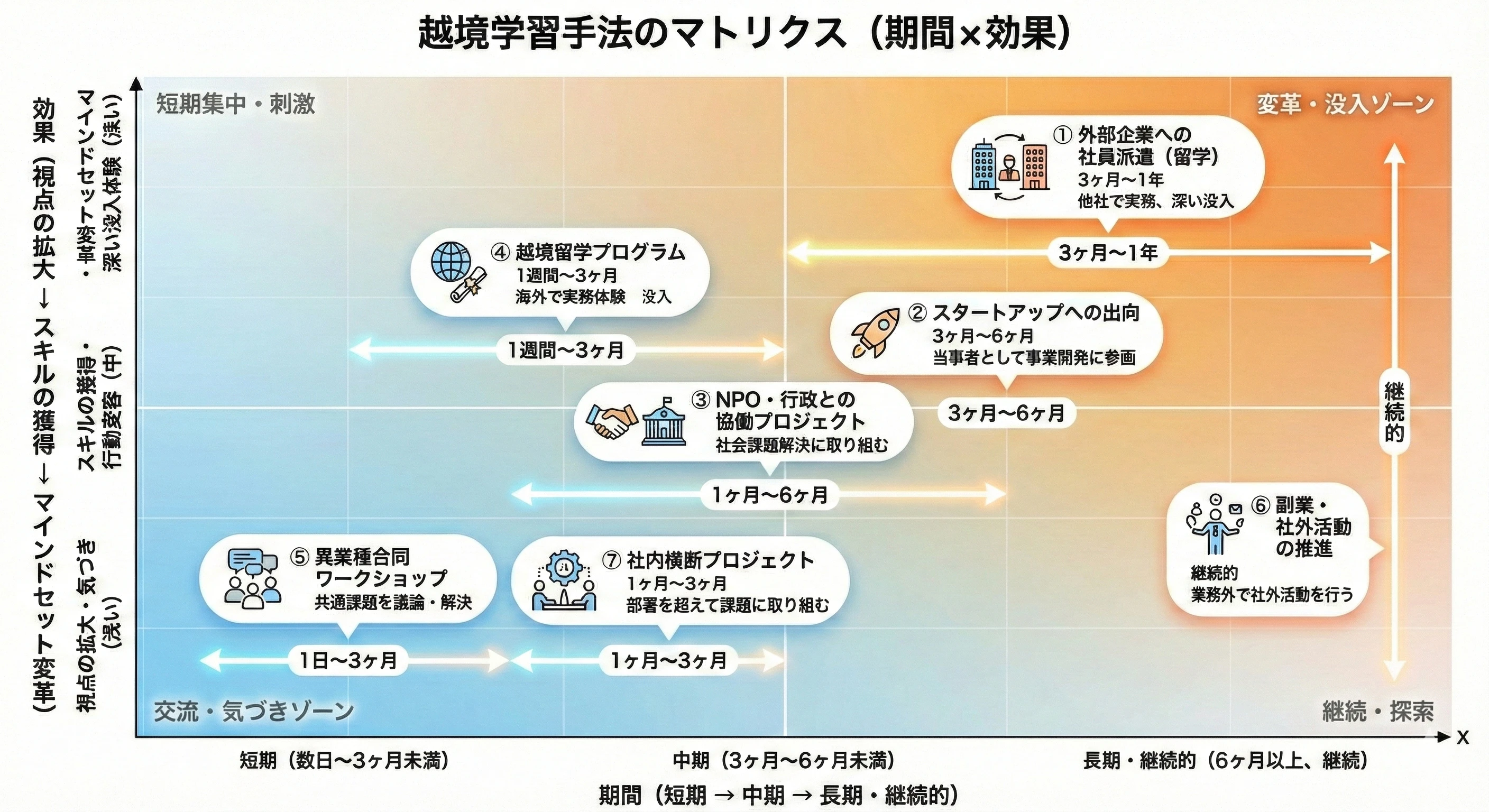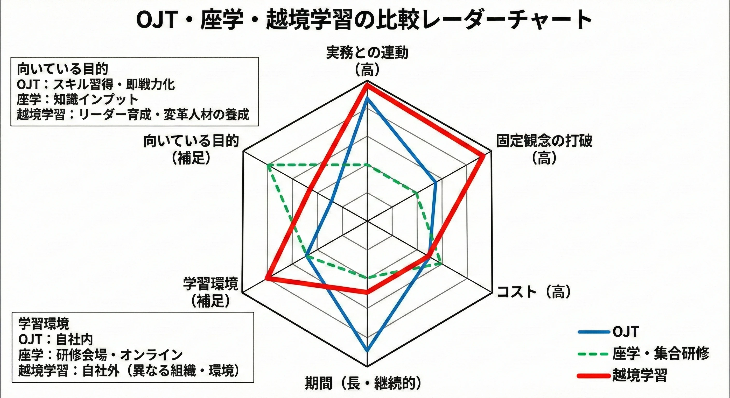 越境学習はOJTや座学と「どちらが優れているか」という比較ではなく、それぞれの補完関係として設計することが重要です。特に「次世代リーダー候補に新しい視点を与えたい」「変革を推進できる人材を育てたい」という目的においては、越境学習が最も有効な手段の一つとなります。