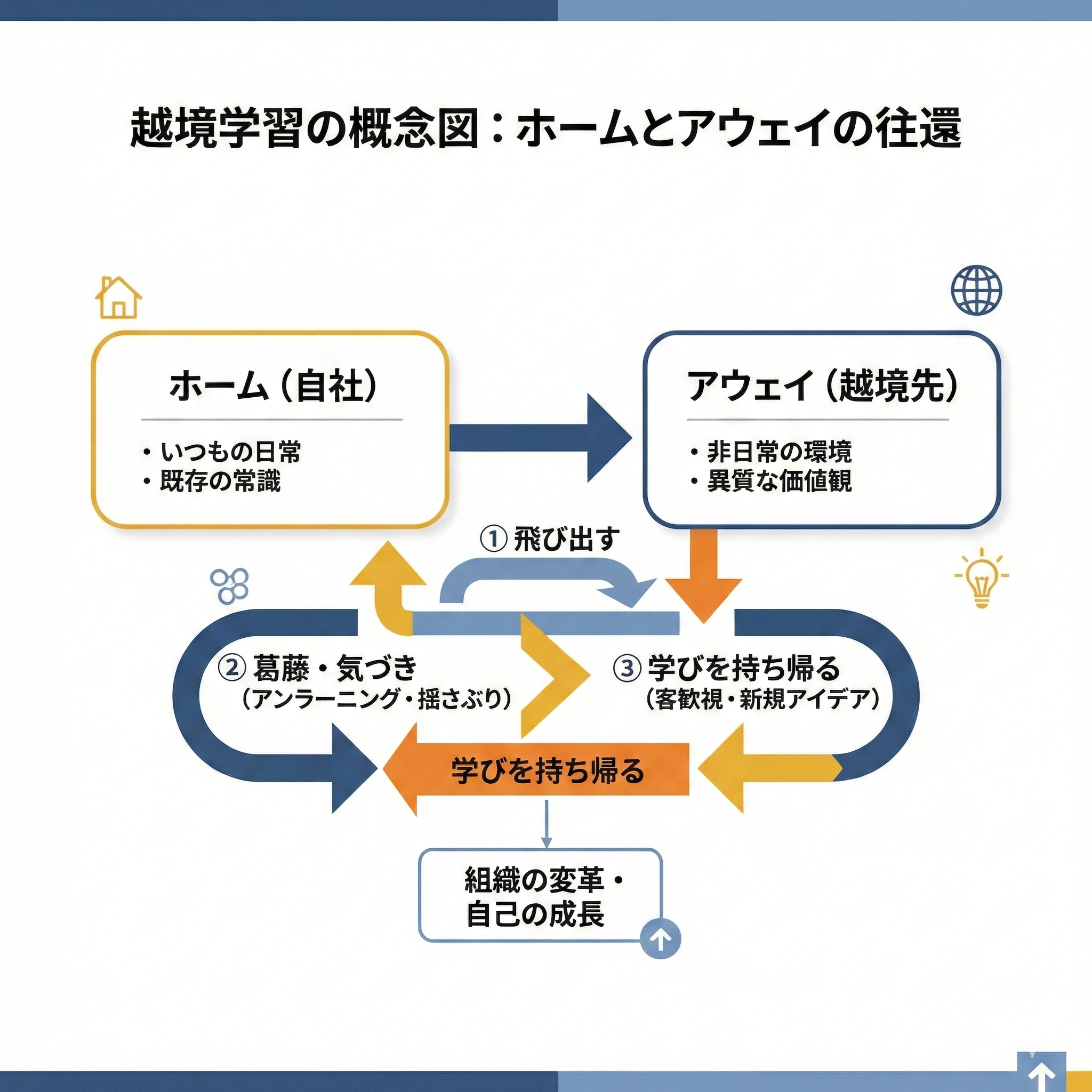 越境学習の学術的背景として、組織行動学者の石山恒貴氏は「ホーム(所属組織)とアウェイ(越境先)を往還するプロセス」と表現しています。アウェイの環境では、これまでの自分の常識が通用せず、戸惑いや葛藤を経験します。しかし、この「揺さぶり」こそが深い学びを生み出す原動力となるのです。