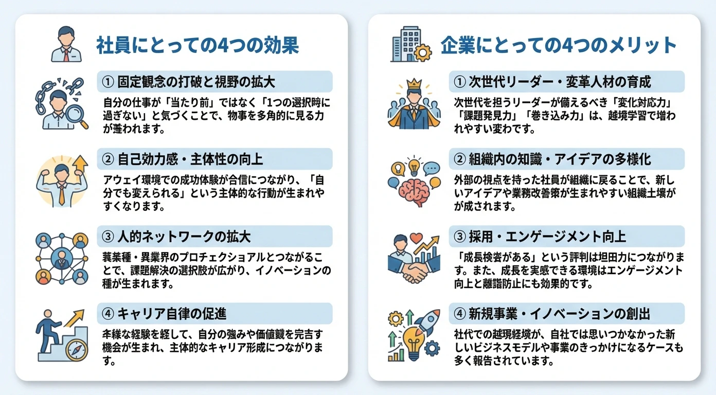 社外での越境経験が、自社では思いつかなかった新しいビジネスモデルや事業のきっかけになるケースも多く報告されています。