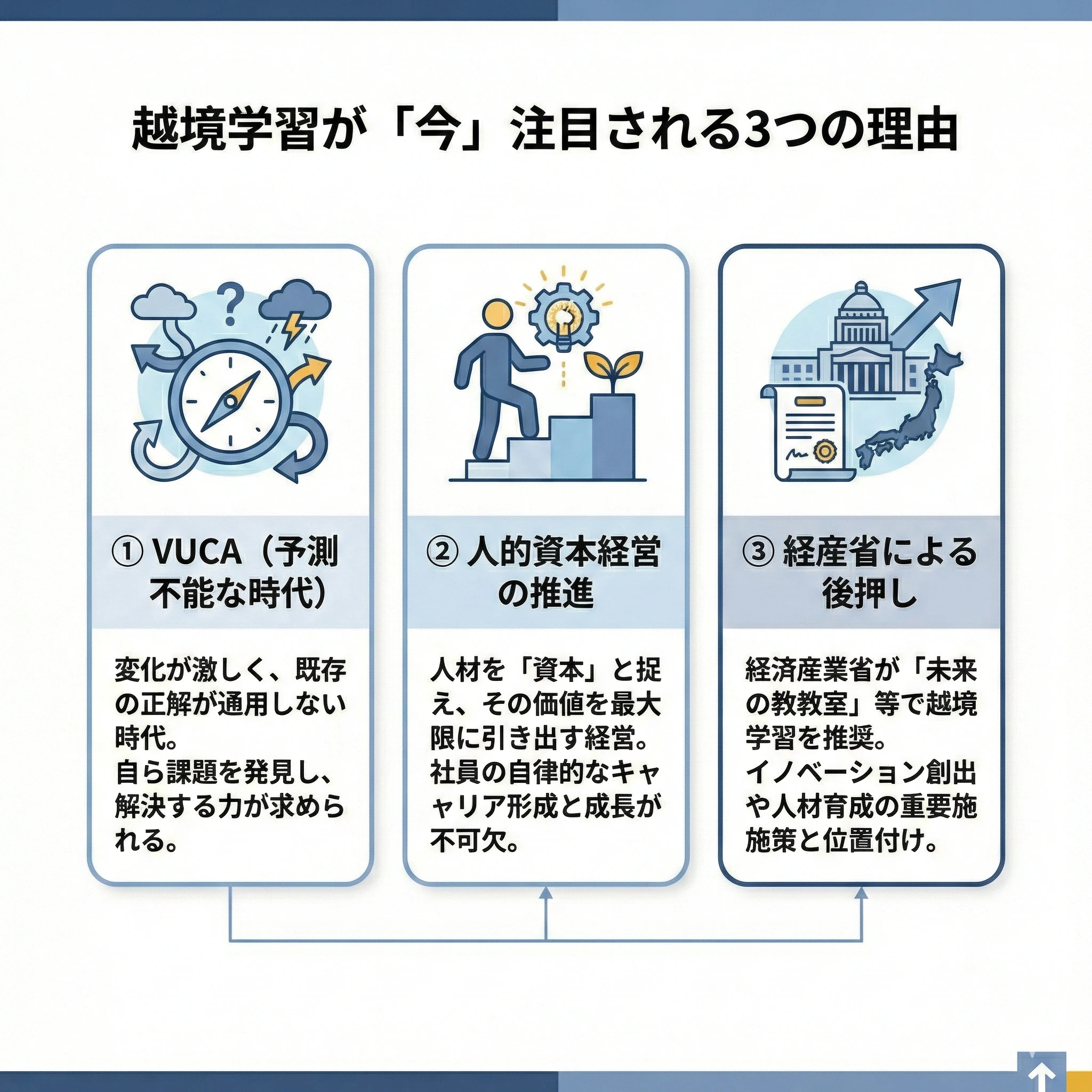 越境学習は以前から存在する概念ですが、近年その重要性が急速に高まっています。そこには主に3つの背景があります。