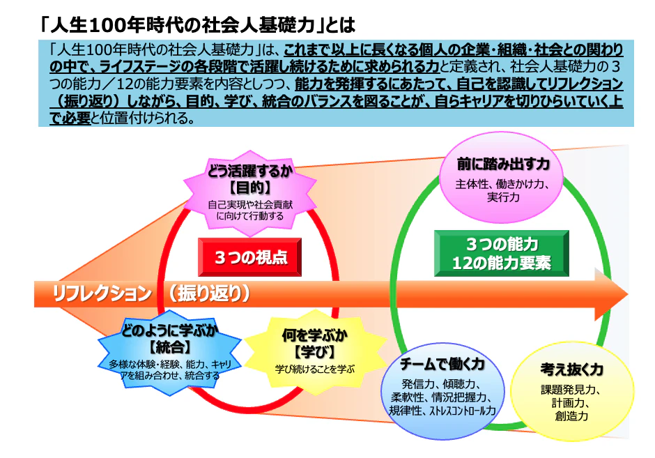 経済産業省が推進する「社会人基礎力(2006年策定・2018年アップデート)」では、「リフレクション(振り返り)」と「多様な他者と協働する力」について強調されています。これらを育む最も効果的な手段のひとつが、越境学習研修です。